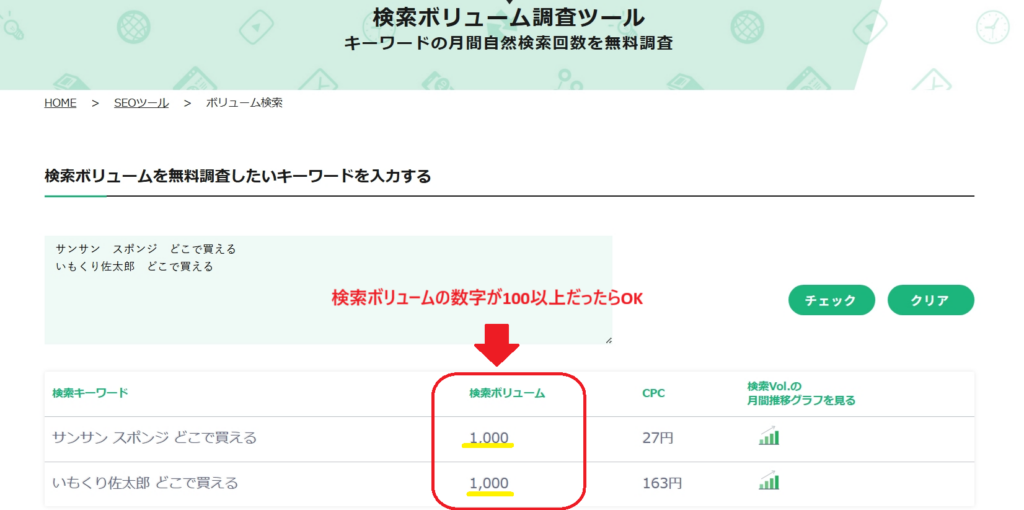 つまり、ここで検索ボリュームを確認しておくことで、書いた記事がムダにならず、成果につながりやすい記事だけを書いていくことができますよ。