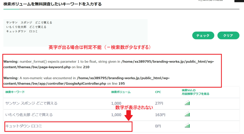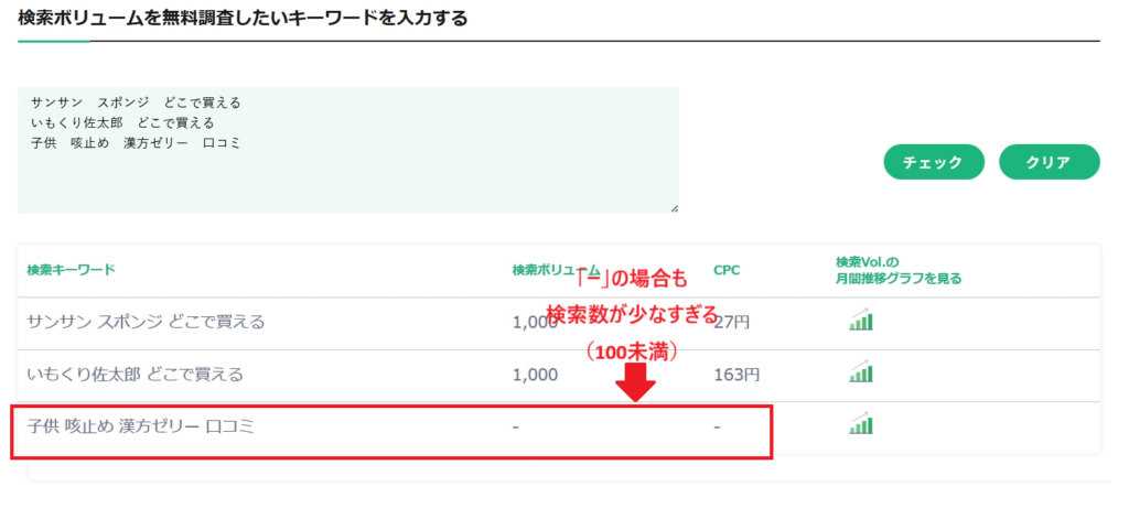 ネコノテツールでは、月間検索数が少なすぎるキーワードでは判定不能になります。
