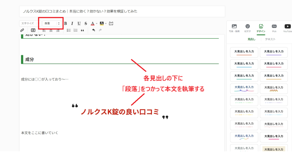 タイトル → 見出し(大見出し/中見出し)まで揃ったら、いよいよ本文を書いていきます。