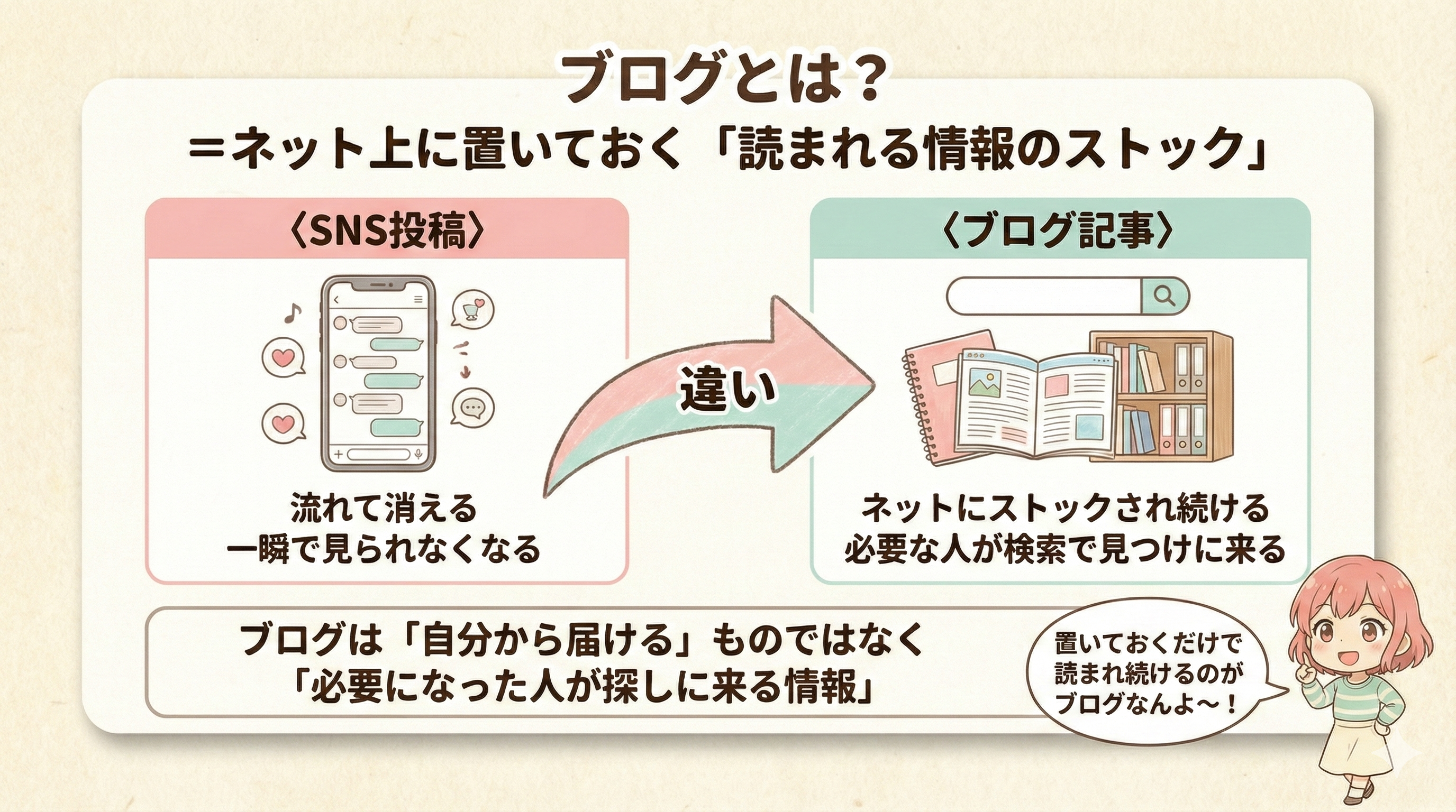 SNSの投稿は流れて消えるけど、ブログの記事は検索で見つけてもらえるストック資産なんですよ〜!