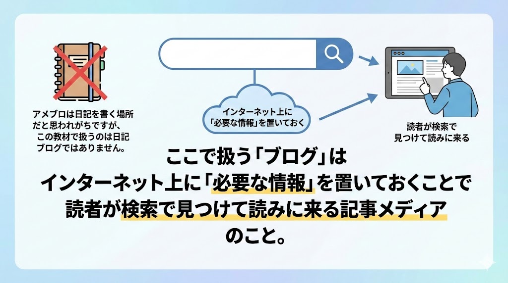 アメブロは日記を書く場所だと思われがちですが、この教材で扱うのは 日記ブログではありません。