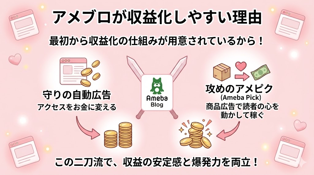 アメブロ収益の正体は、この二刀流にあります。 ひとつは、アクセスをお金に変える『守りの自動広告』。もうひとつは、読者の心を動かして稼ぐ『攻めの商品広告』。この2つを同時に走らせることで、収益の安定感と爆発力を両立させるんです。