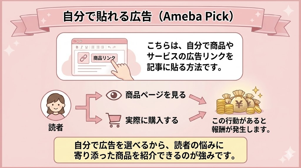 | 自分で貼る広告(Ameba Pick) | 商品リンクを貼るだけ | 商品が買われた時 | 単価が高い・伸ばしやすい |