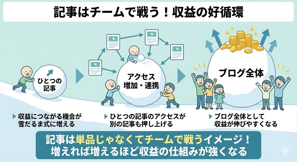 ✔ 1記事で稼ぐのではなく、記事がチームとして働く